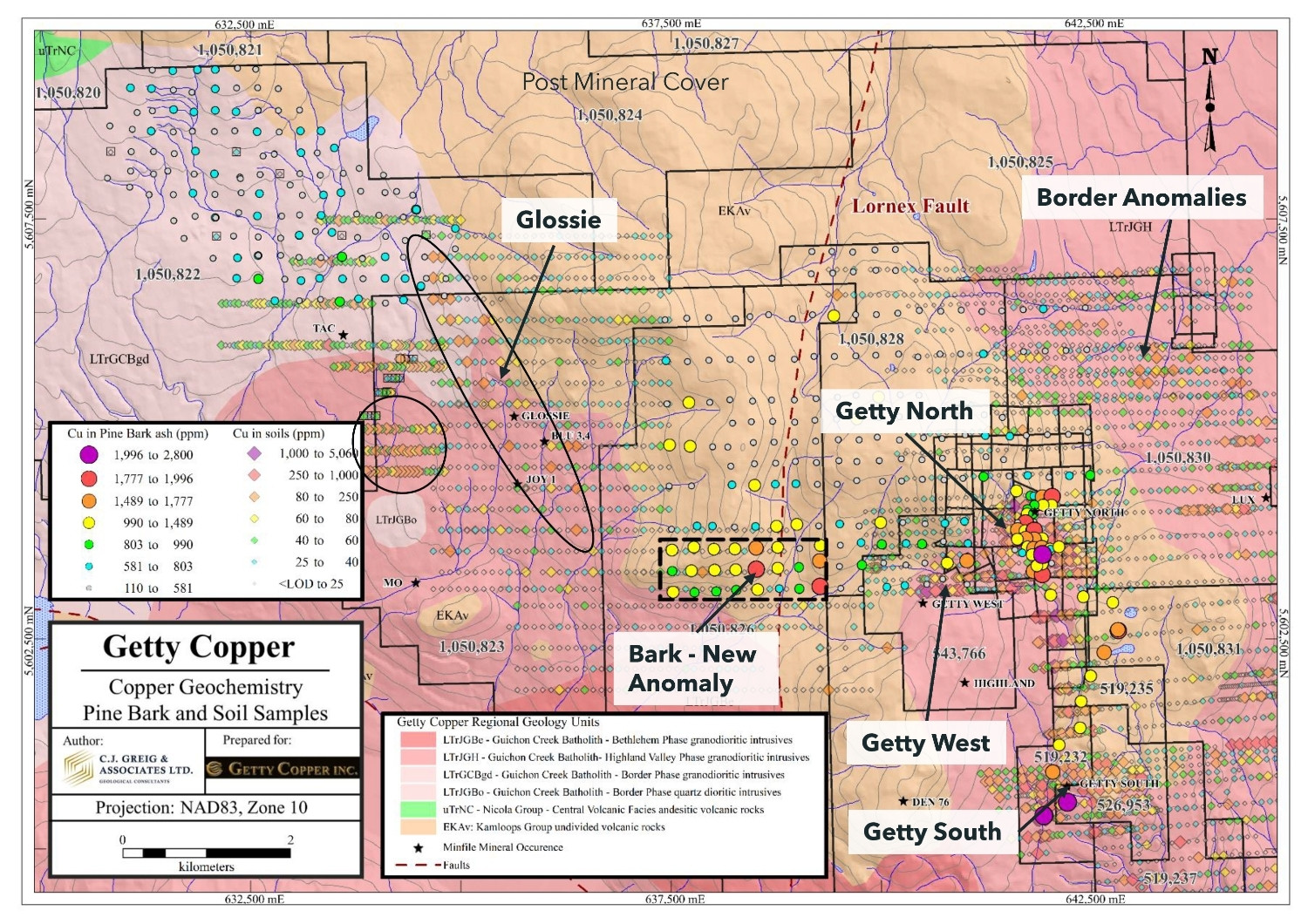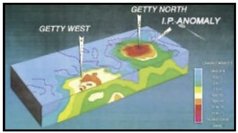 Getty West is one of the more advanced opportunities in the Company’s broader, district-scale exploration pipeline and is characterized by a broad porphyry-style system associated with a large, mostly untested IP chargeability anomaly. Drilling has intersected both oxidized and sulphide copper mineralization within a porphyry dike swarm. Notably, drill hole GL96-08 returned 42 m @ 0.26% Cu and 0.02% Mo, and has not been followed up.